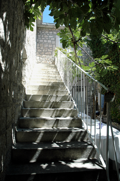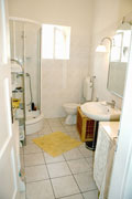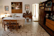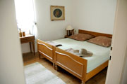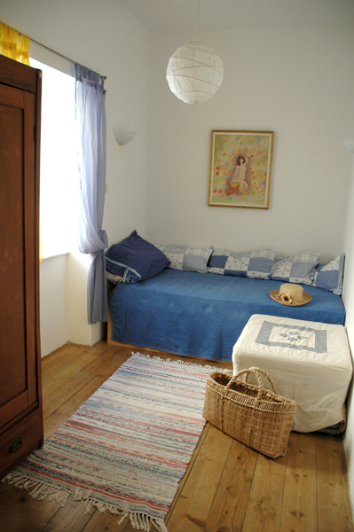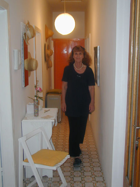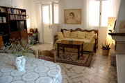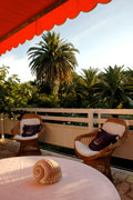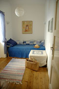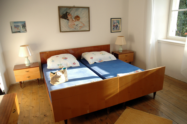 Die obere Wohnung ist circa 90qm groß. Das Wohnzimmer hat einen offenen Kamin und eine Durchreiche zur Wohnküche. Die Küche ist mit Herd, Spüle und Kühlschrank ausgestattet. Die drei Schlafzimmer bieten für bis zu sechs Personen Platz. Das Bad wurde im Jahr 2002 rundum erneuert. Von der großen Terrasse blickt man auf die immergrüne Palmenallee.